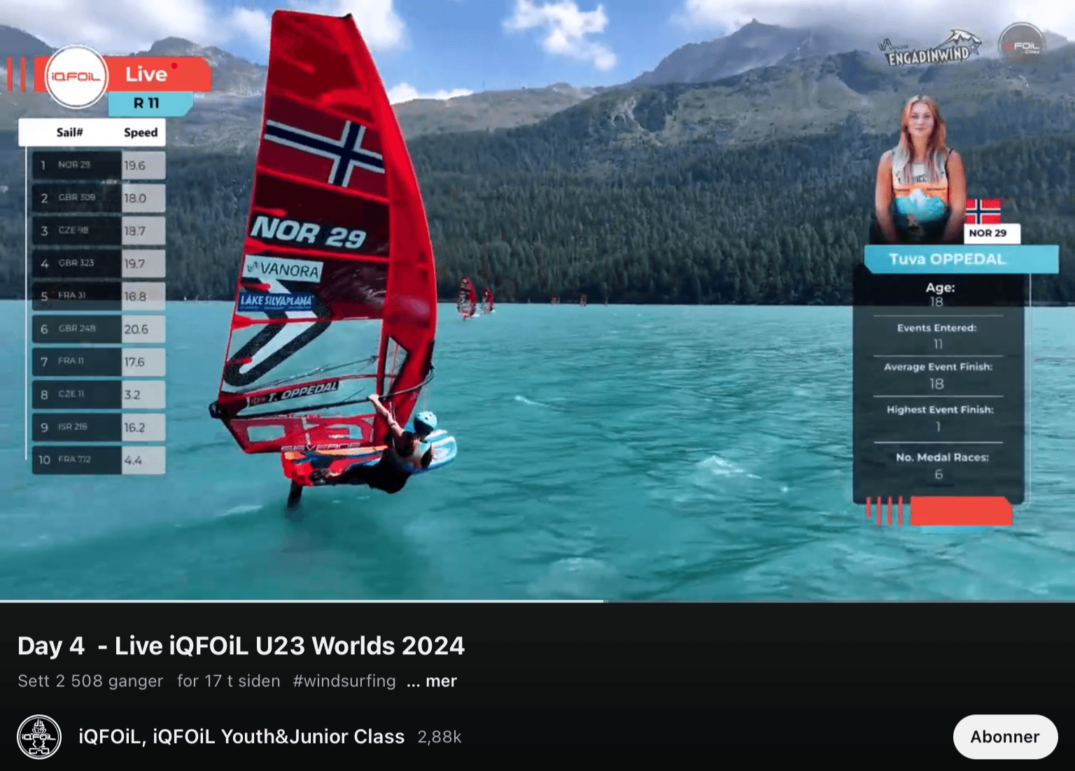 Tuva fikk nok en topplassering i VM med bronse under U23 Verdensmesterskapet for iQFOiL i Silvaplana, Sveits. Videoen under er fra fredagens seilas. Se gjerne fra 1:05:45 ut i videoen som er fra starten på seilasen som Tuva vant.